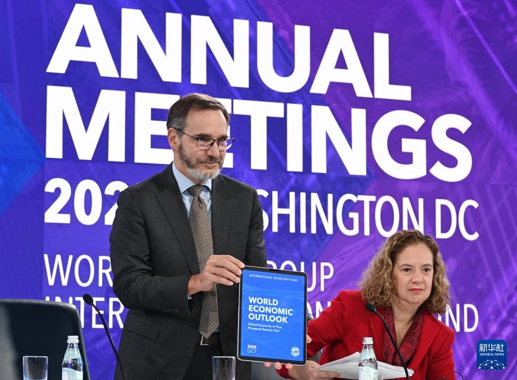10月14日,在美国华盛顿,国际货币基金组织首席经济学家皮埃尔-奥利维耶·古兰沙(左)在《世界经济展望报告》星空(中国)发布会上展示报告。