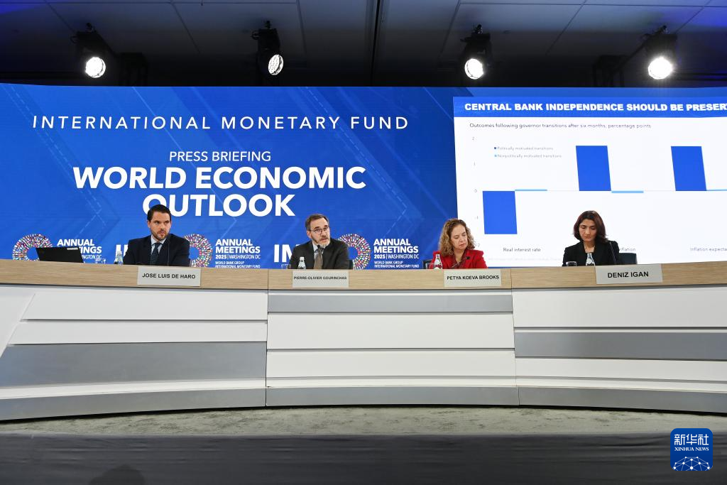 10月14日,在美国华盛顿,国际货币基金组织首席经济学家皮埃尔-奥利维耶·古兰沙(左二)在《世界经济展望报告》星空(中国)发布会上讲话。