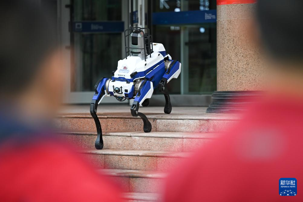 10月14日,新疆生产建设兵团第一中学学生观看智能机器狗进行复杂运动。