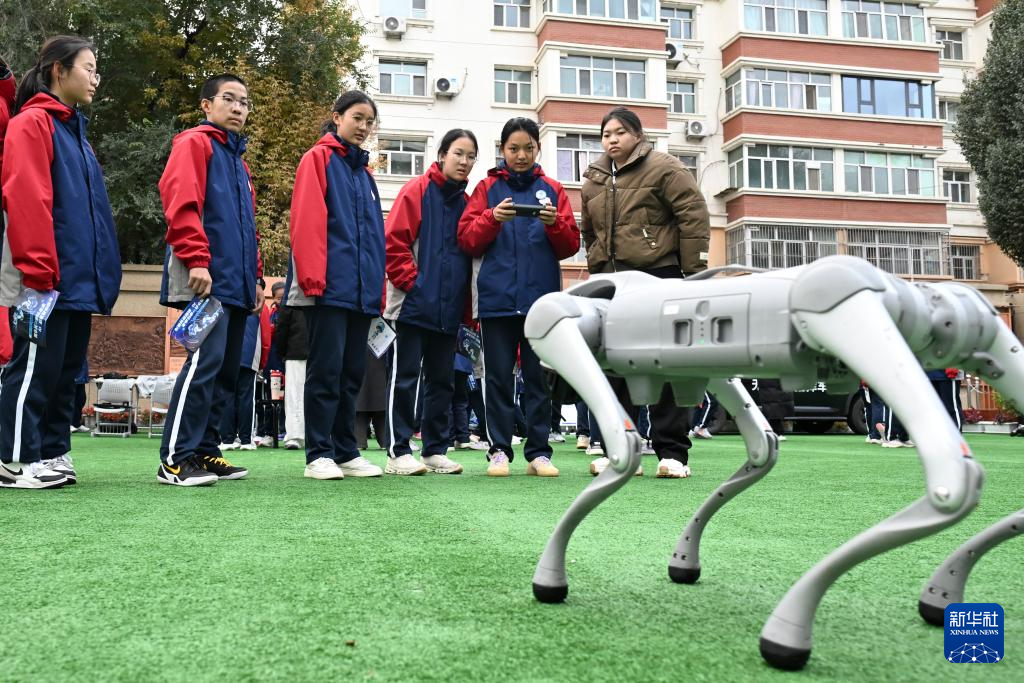 10月14日,新疆生产建设兵团第一中学学生在工作人员的指导下体验遥控智能机器狗。