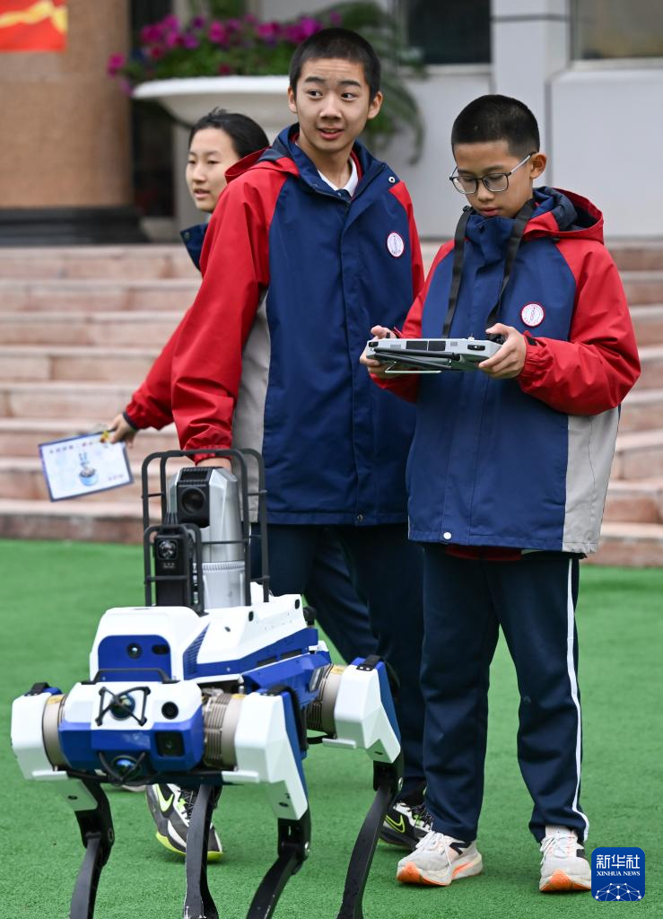 10月14日,新疆生产建设兵团第一中学学生体验遥控智能机器狗。