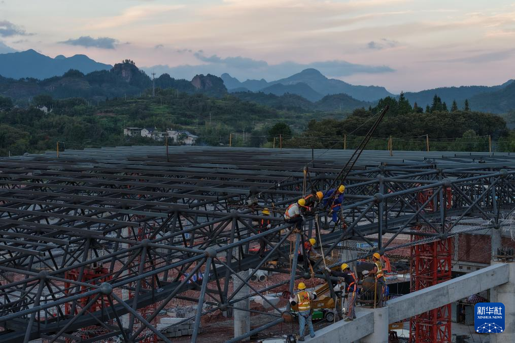 10月14日,建设者在衢丽铁路东西岩站站房候车厅钢网架上作业(无人机照片)。