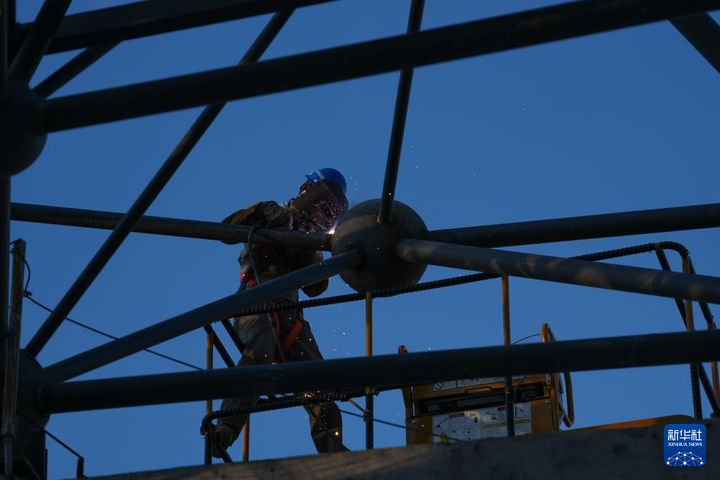 10月14日,建设者在衢丽铁路东西岩站站房候车厅钢网架上进行焊接作业。