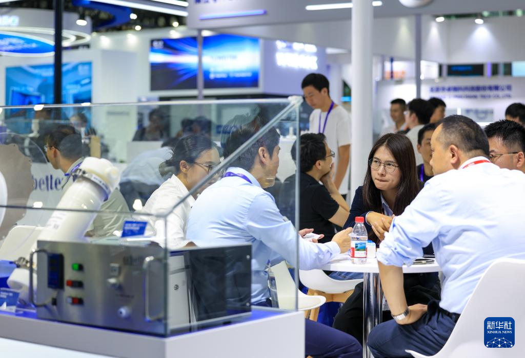 10月15日,客商在一家半导体企业展台交流。