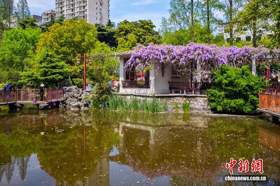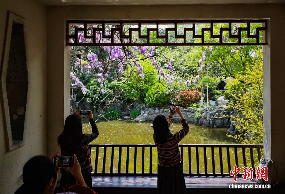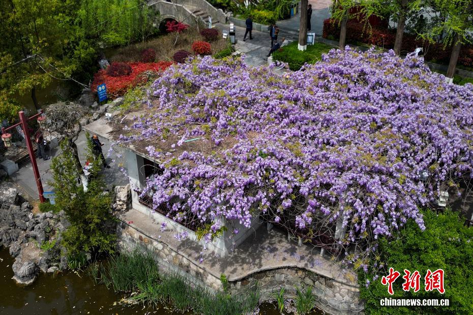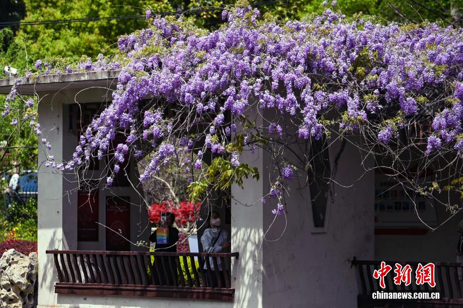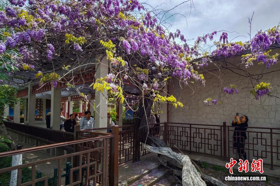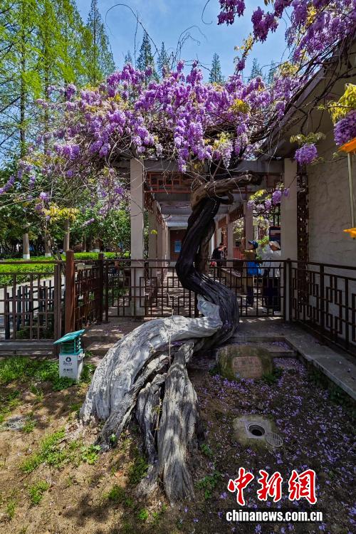 4月7日,江苏南京,郑和公园内有着600多年树龄的紫藤进入盛花期,繁花垂帘如瀑,蔚为壮观。据悉,这棵紫藤为南京市一级古树名木,编号826,虬枝苍劲古朴。