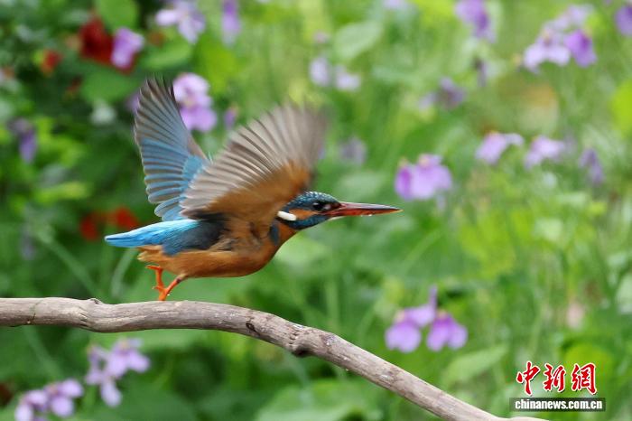 4月7日,南京古林公园内,翠鸟从水边的树枝上展开翅膀飞翔。中新社记者 泱波 摄