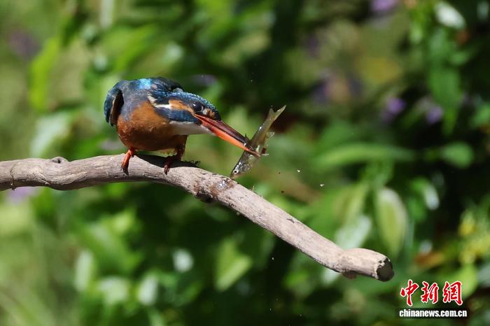 4月7日,南京古林公园内,翠鸟停歇在水边的树枝上进食捕到的小鱼。中新社记者 泱波 摄