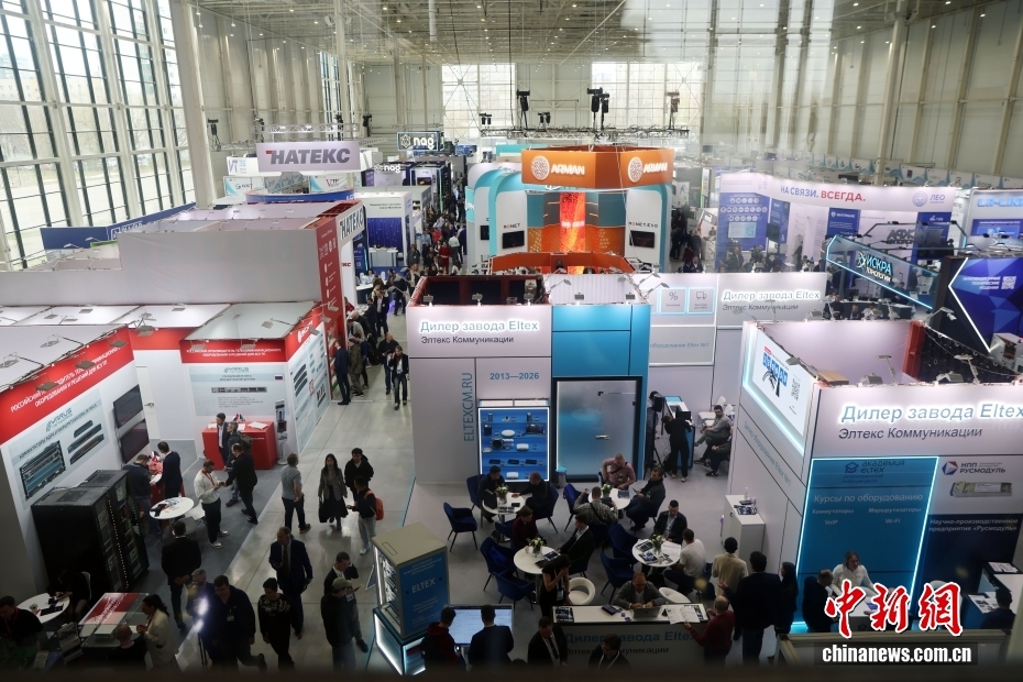 当地时间4月7日,第38届俄罗斯国际信息与通信技术展览会在莫斯科开幕。本届展会是2026年“俄罗斯高科技周”的一部分。该展会是俄罗斯、独联体及东欧地区规模最大的信息技术展会和专业平台,来自中国安徽、河北、广东、湖南、江苏、陕西、北京等省区市的众多企业参展。图为展览会现场。