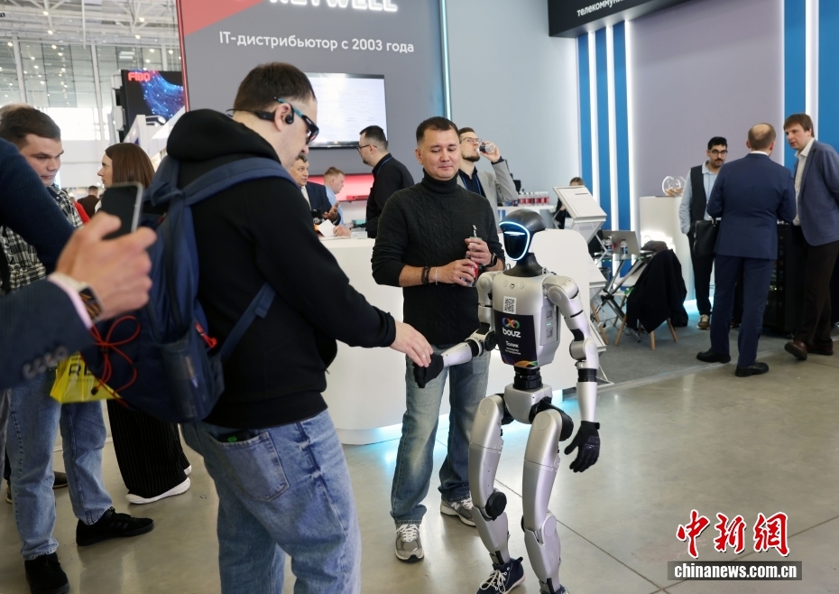 当地时间4月7日,第38届俄罗斯国际信息与通信技术展览会在莫斯科开幕。本届展会是2026年“俄罗斯高科技周”的一部分。该展会是俄罗斯、独联体及东欧地区规模最大的信息技术展会和专业平台,来自中国安徽、河北、广东、湖南、江苏、陕西、北京等省区市的众多企业参展。图为展览会上机器人与参观者互动。