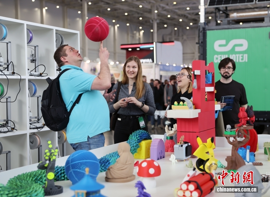 当地时间4月7日,第38届俄罗斯国际信息与通信技术展览会在莫斯科开幕。本届展会是2026年“俄罗斯高科技周”的一部分。该展会是俄罗斯、独联体及东欧地区规模最大的信息技术展会和专业平台,来自中国安徽、河北、广东、湖南、江苏、陕西、北京等省区市的众多企业参展。图为参观者试玩中国企业3D打印的篮球。