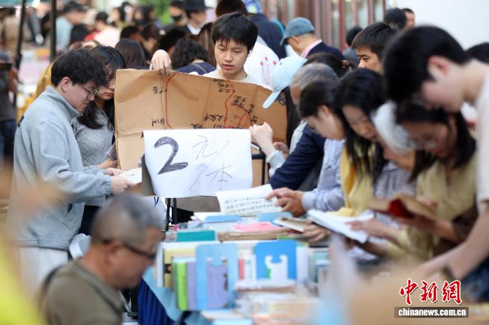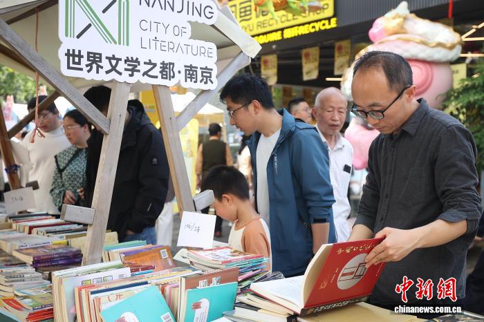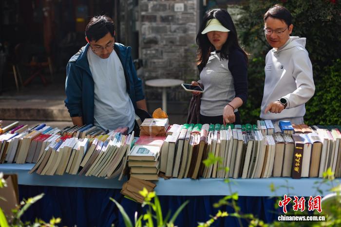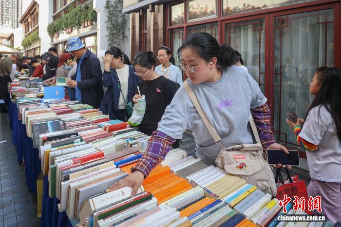 4月19日,江苏南京,市民在金陵旧书市集上淘书。日前,以“旧书新知 书香南京”为主题的金陵旧书市集在城南古巷熙南里街区开启,覆盖古旧书市、古籍科普、以旧换新、非遗工坊等七大类别,一站式满足民众淘书、研学、互动、消费等多种需求。中新社记者 泱波 摄