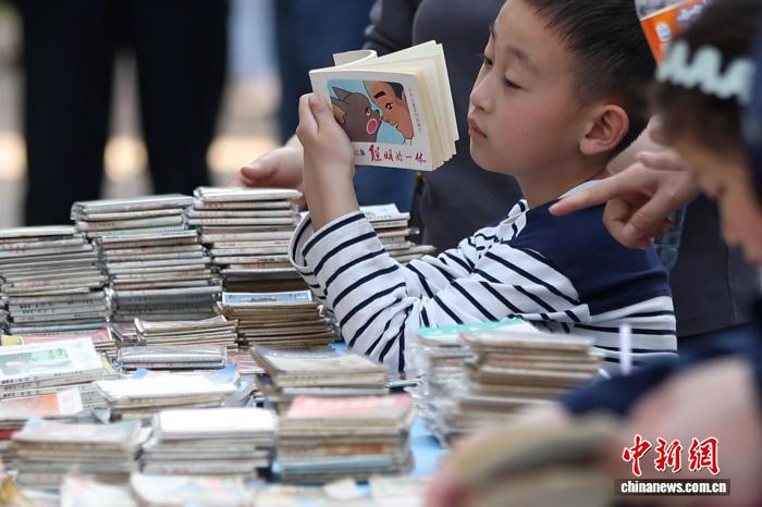 4月19日,江苏南京,小朋友在金陵旧书市集上阅览小人书。日前,以“旧书新知 书香南京”为主题的金陵旧书市集在城南古巷熙南里街区开启,覆盖古旧书市、古籍科普、以旧换新、非遗工坊等七大类别,一站式满足民众淘书、研学、互动、消费等多种需求。中新社记者 泱波 摄