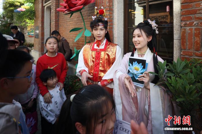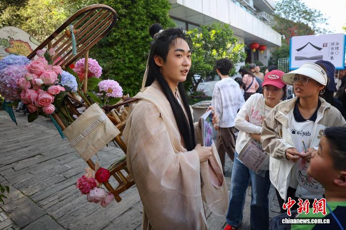4月19日,江苏南京,古装打扮的年轻人在金陵旧书市集上与市民互动。日前,以“旧书新知 书香南京”为主题的金陵旧书市集在城南古巷熙南里街区开启,覆盖古旧书市、古籍科普、以旧换新、非遗工坊等七大类别,一站式满足民众淘书、研学、互动、消费等多种需求。中新社记者 泱波 摄
